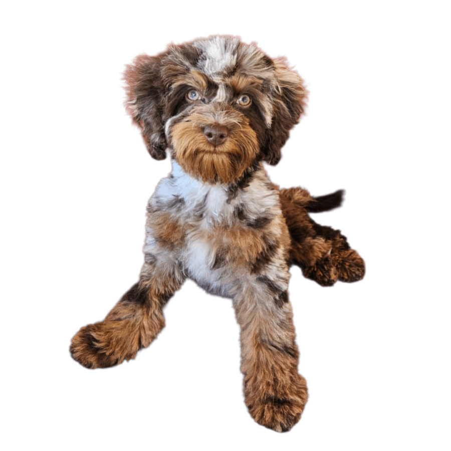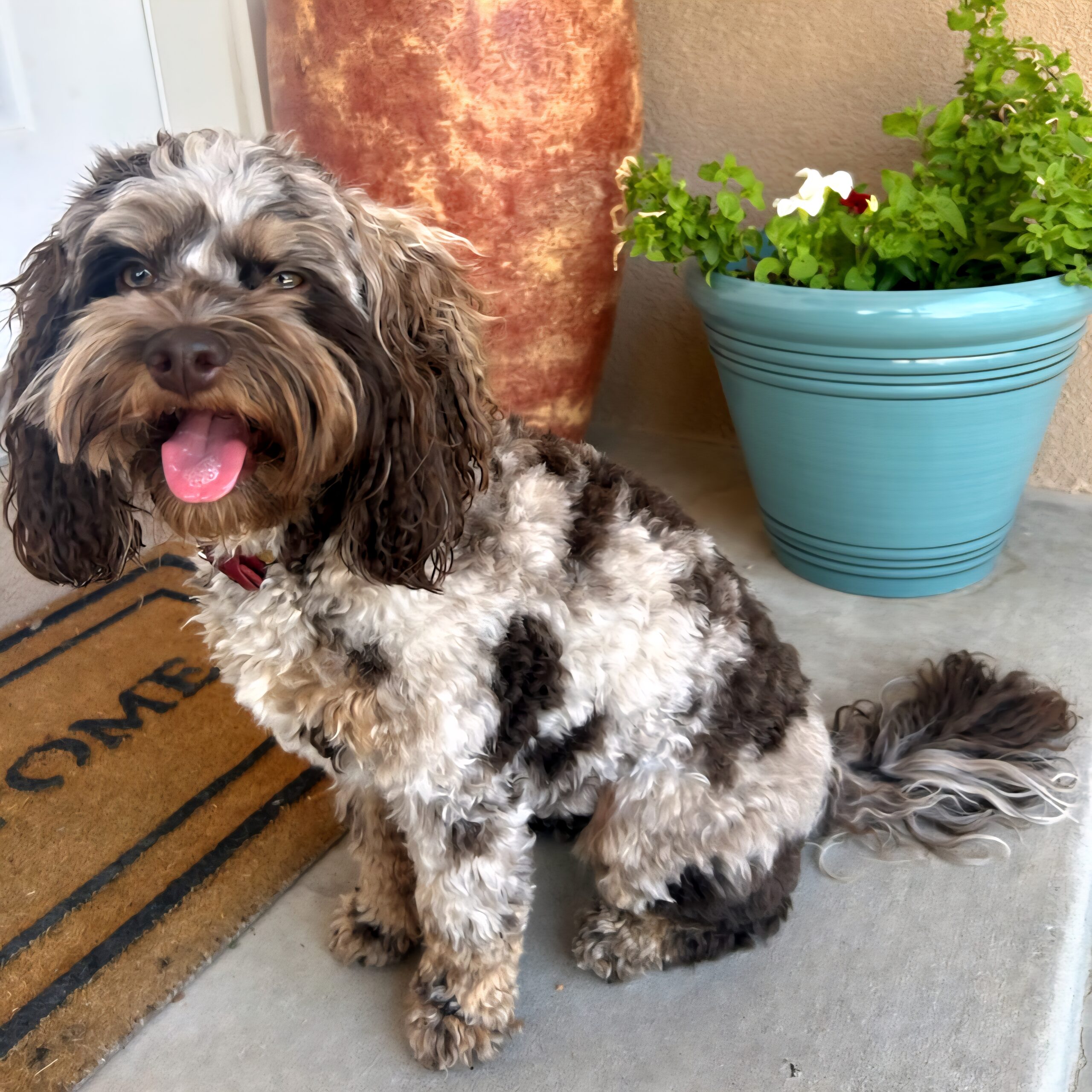 California Painted Lady is a stunning third-generation Cockapoo with a silky-soft, wavy chocolate phantom merle coat that is as eye-catching as it is luxurious. Her well-balanced structure and rich coloring with beautiful patterning gives her an elegant presence that immediately stand out. Painted Lady has a sweet, playful, affectionate temperament and a gentle, people-loving nature that makes her a joy to be around. She is intelligent, intuitive, and eager to please, traits that are signature qualities of the Cockapoo breed. Painted Lady is the sweetest girl, and a wonderful example of the beauty, temperament, and consistency our program strives for.